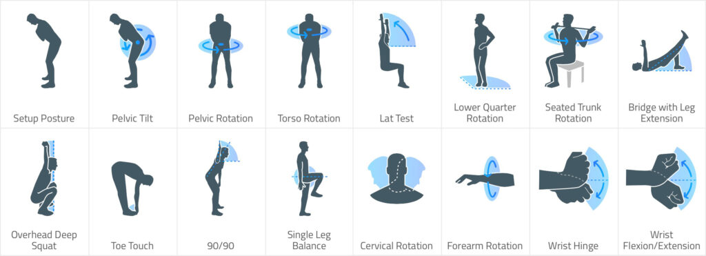 16 tests pour évaluer la posture de golf en priorité et cibler toutes les zones articulaires du corps, ainsi que les possibles limitations musculaires. La stabilité, la force et l’équilibre sont aussi évalués.